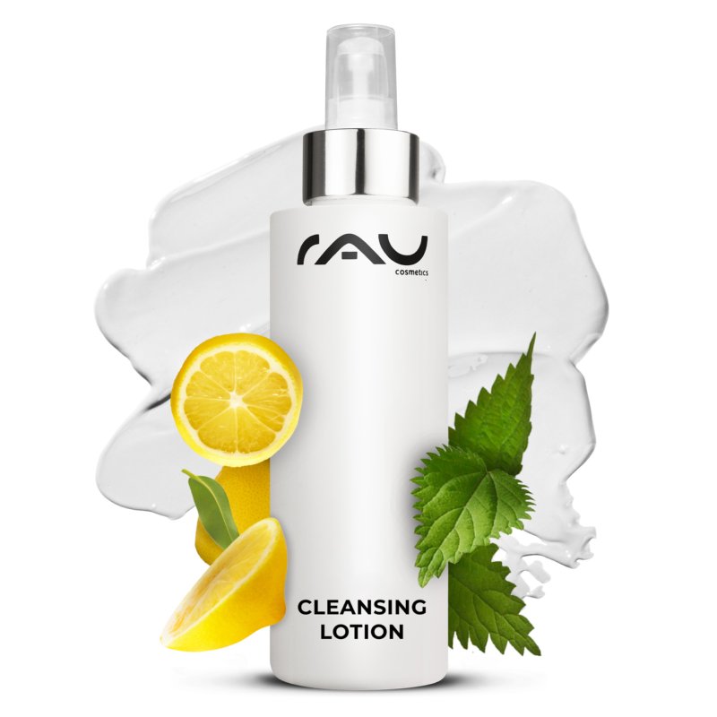 Die RAU Cleansing Lotion ist eine sanfte Reinigungsmilch fuer die taegliche Gesichtsreinigung. Die Formulierung mit Brennnessel-Extrakt und einem milden Fruchtsaeurekomplex aus Zitronensaeure, Milchsaeure und Weinsaeure entfernt Make-up, Schmutzpartikel und ueberschuessigen Talg gruendlich — ohne die Haut auszutrocknen. Der pH-Wert von ca. 7 respektiert den natuerlichen Saeuremantel. 200 ml Profigroesse fuer ca. 90 Tage Anwendung.