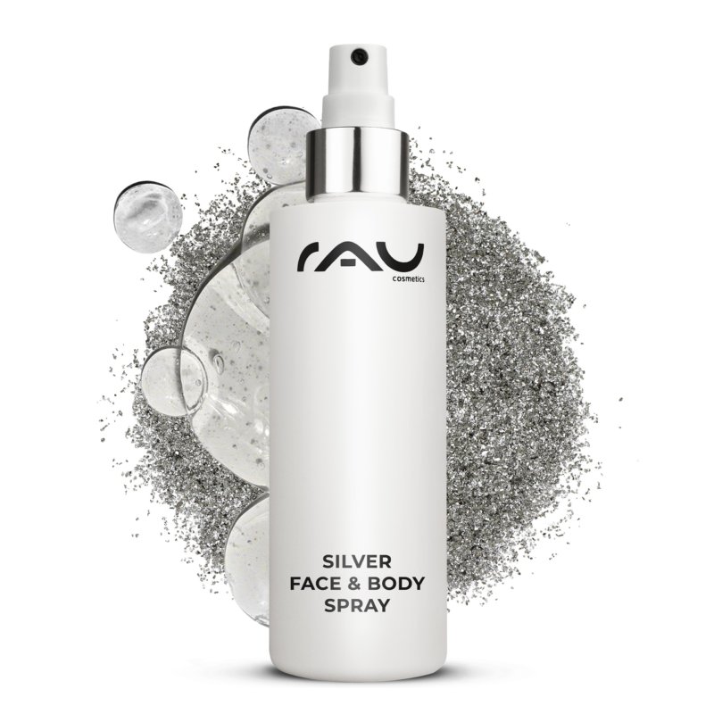 The spray belongs to our top-selling series, the Silver Series, which has already helped numerous customers to achieve clear and even skin with its main active ingredient MicroSilver BG™. Our new RAU Silver Face & Body Spray can soothe skin irritations and support skin regeneration. In addition, microsilver actively combats skin impurities. The fine silver ions gently neutralise germs directly on the skin surface. The spray also contains panthenol, a popular active ingredient to soothe and moisturise the skin. The spray is particularly practical. It's hygienic, you don't have to get your hands dirty, just spray it on and a large area is covered. It's also easy to apply to the back and fight pimples there too. We also like to use the soothing spray after shaving - the skin is soothed and immediately supplied with moisture. This prevents irritation. With regular use, the skin can be permanently stabilised.